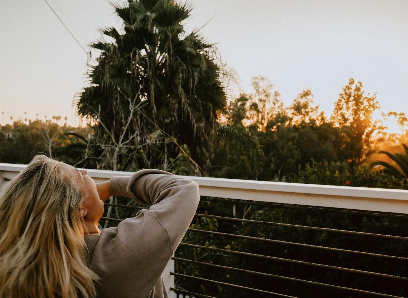 Visual Description: Woman with medium-length, blonde hair standing outside on a balcony laughing happily while watching the sunrise.